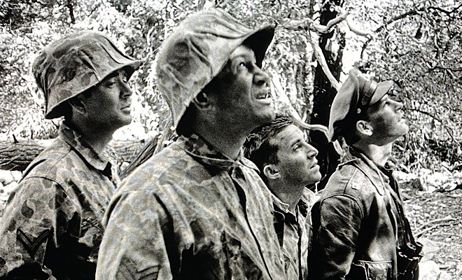 Kubrick's fingerprints are all over the film. He produced, directed, shot, and edited Fear and Desire, displaying an admirable breadth of talent. The choppy editing is jarring, but fuels the sense of unease and psychological conflict that pervades the narrative. Inventive camera angles and stirring focal points keep the eye engaged, most notably during an ambush sequence in which the GIs disrupt the dinner of some enemy officers. Zeroing in on splattering, half-eaten food instead of blood and guts is a stroke of genius that underscores the encounter's ugliness and barbaric nature. Another scene that depicts the battle of wits between an aroused soldier and the captive woman the GIs have tied to a tree is equally disturbing and well crafted.