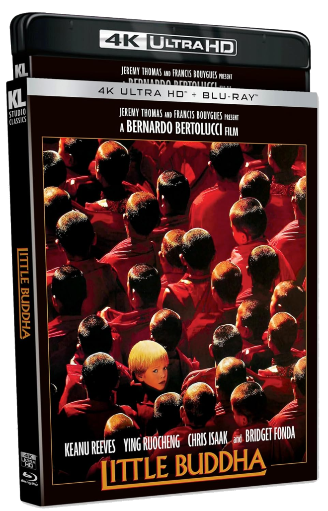 Kino Lorber brings Little Buddha to 4K UHD in a two-disc release. Both discs are housed in a standard case with a removable slipcover containing identical, original poster artwork from the film’s original release and subsequent home video releases. The cover art features the child Alex among a sea of grown-up Buddhist monks.