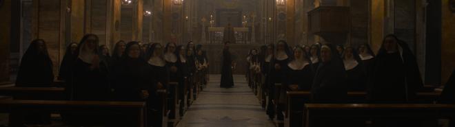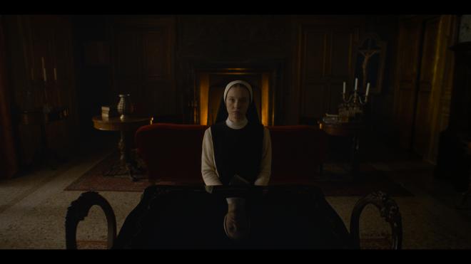 With Dolby Vision HDR (and HDR10), the transfer really blossoms giving more care and attention to the black levels, shadows, and crisp whites throughout the film. Primaries are strong and vivid with Red seeing extra attention. Black levels are especially lovely in that wonderfully horrific sort of way where you can feel like anything can be lurking in the dark (there often is!). The Nun’s habits don’t become black blobs avoiding crush. Whites are crisp without blooming.