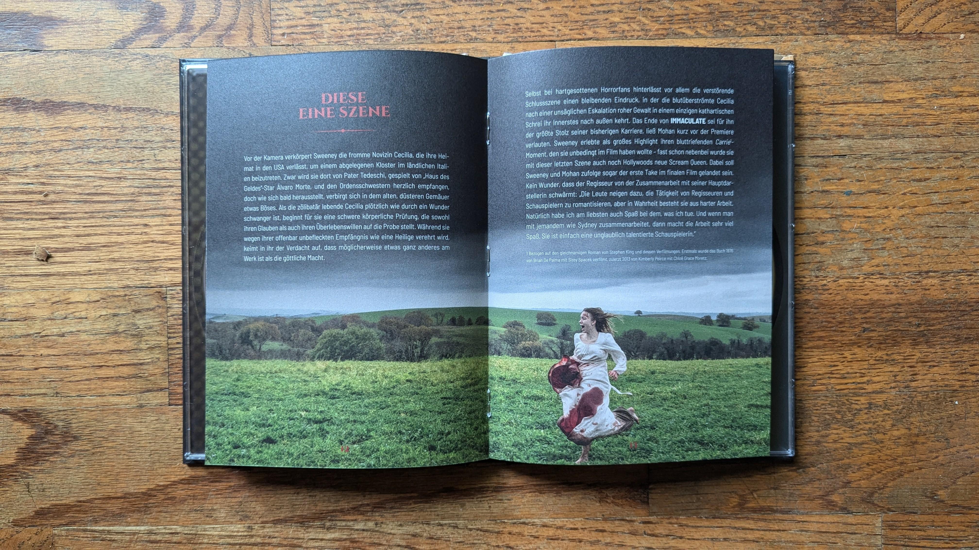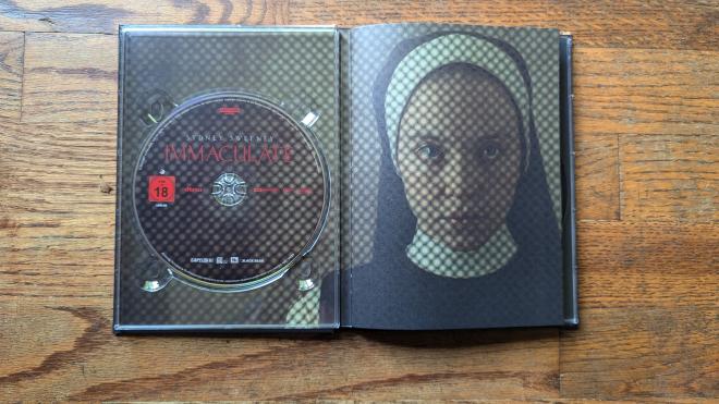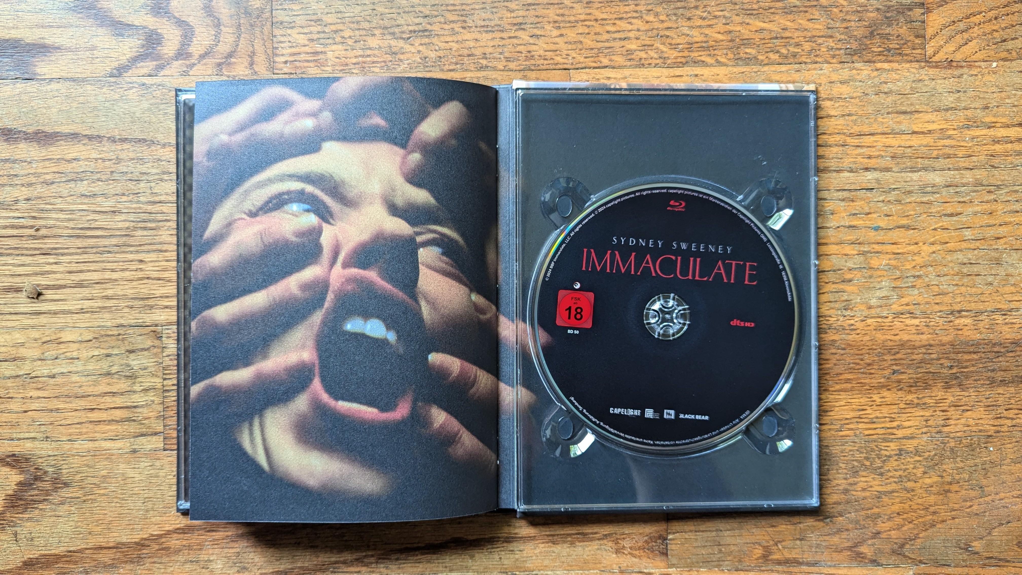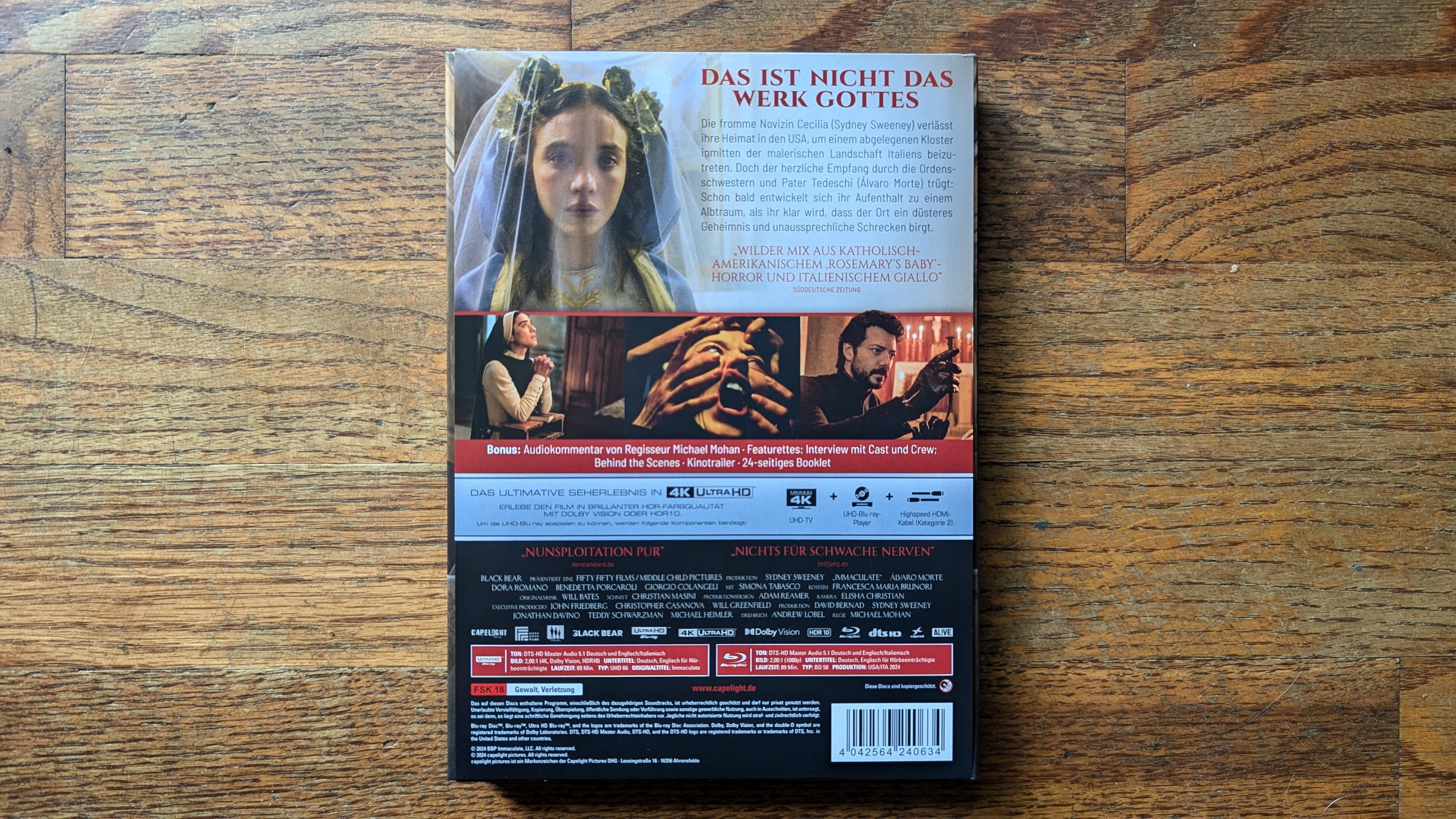 Thanks to Germany’s Capelight Films, Immaculate is birthed onto 4K Ultra HD Blu-ray in a two-disc 4K UHD + Blu-ray Mediabook. The 4K is pressed on a Region Free BD-66 disc with a Region Free BD-50 disc serving up the 1080p version. Both discs are housed in a lovely Mediabook offering a 24-page booklet with essays and info about the film. The Booklet content is in German, but as I’ve mentioned in past Mediabook import reviews, using the Google Translate app on my phone is a pretty effective way to read through that content. Each disc loads to an animated main menu, menu options are in German, but it’s pretty intuitive to figure out what is what.
