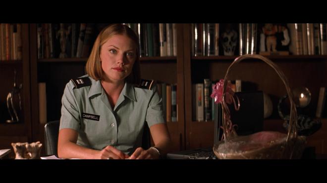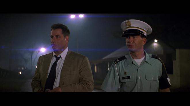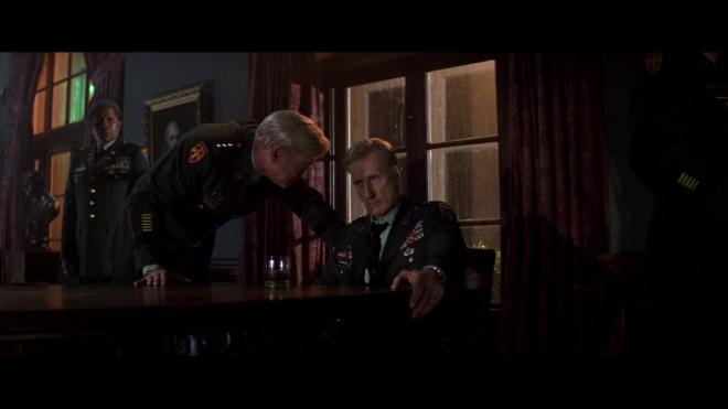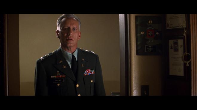 To his credit - as in, despite the plot's unsettling premise and treatment of it - West displays a knack for crafting a slick, visually appealing film, much of which works well for building tension and intrigue. The confident camerawork has that glossy, polished, big-budget sheen typical of 90s and early 00s action flicks, which he also displayed in Con Air and Lara Croft: Tomb Raider, full of creative and dynamic angles that make excellent use of light and shadow to create an engaging tone. And much of this is also thanks to Peter Menzies Jr.'s beautifully striking cinematography, capturing both the suffocating bureaucracy of the military and the languid Southern atmosphere in equal measure.