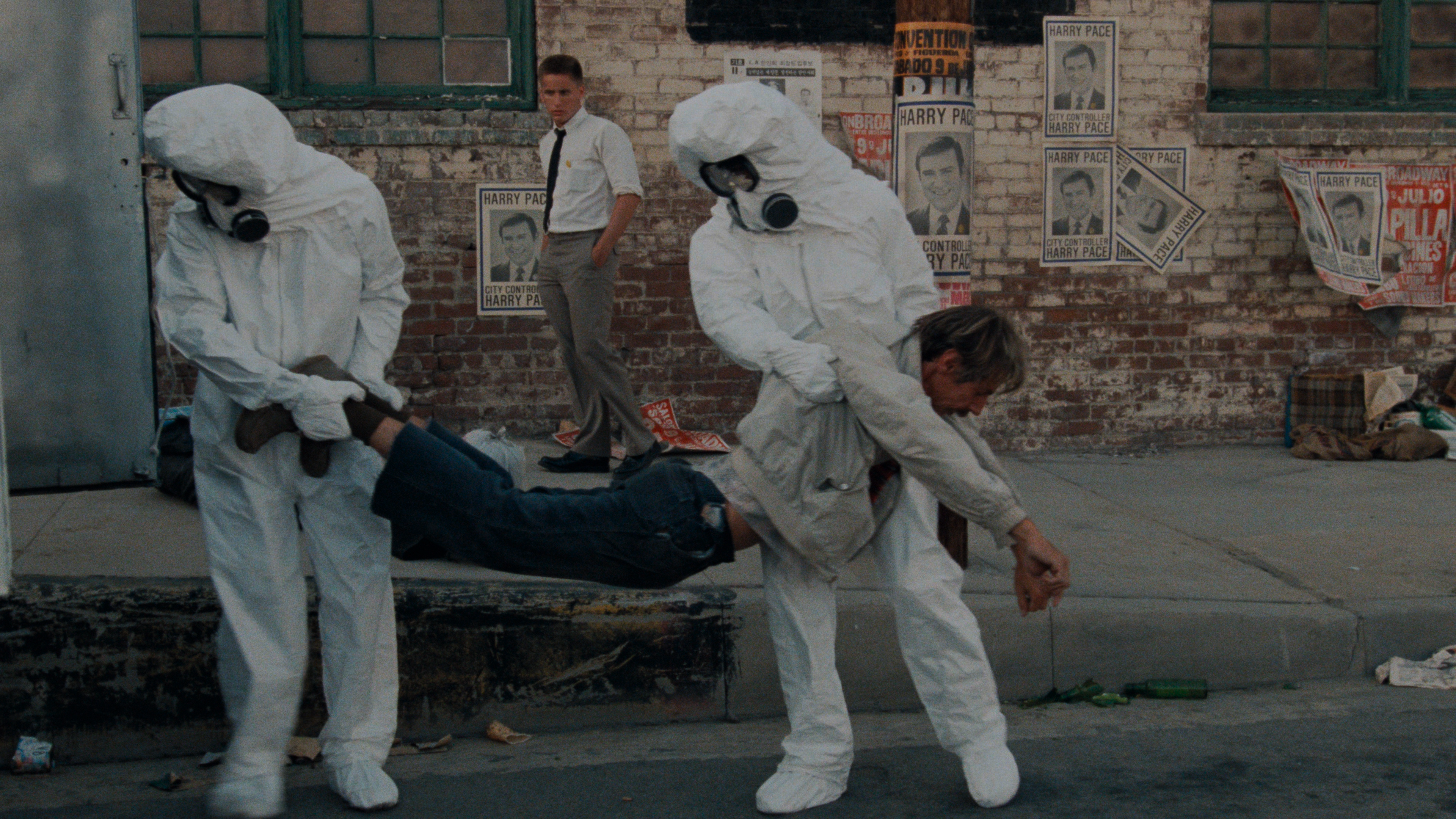 According to the accompanying booklet, this fresh, new HEVC H.265 encode was remastered from the original 35mm camera negatives and approved by Alex Cox. When comparing this Ultra HD release with its Blu-ray predecessor, I can confidently say that this 4K UHD edition will stand as the definitive version of this cult favorite. Presented in Cox's preferred 1.78:1 aspect ratio, the forty-year-old movie arrives with excellent definition in the clothing, cars and architecture of Los Angeles' business district. Although a couple of scenes fall slightly below average, looking a tad soft and blurry, the native 4K transfer is remarkably sharp with distinct, often striking details overall while awash with a thin veil of film grain throughout, giving it an attractive and appreciable film-like quality.