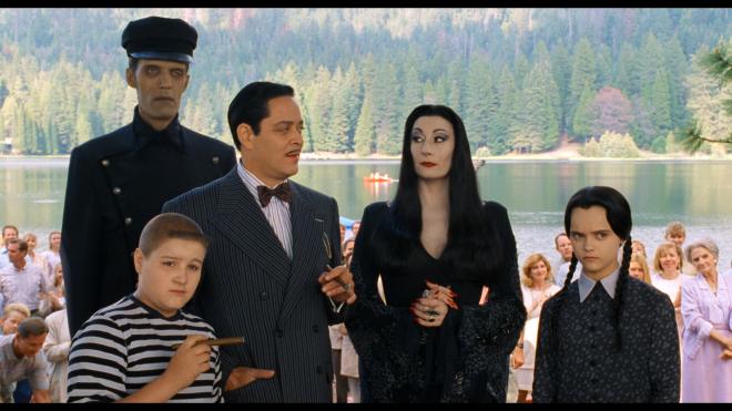 Much like the first film, Addams Family Values is a sort of mixed bag of visual tricks. From sped-up frame rates to early CGI compositing, to classic optical effects, the film can have the occasional visual inconsistency here and there, but boy does this 4K Dolby Vision transfer give us the best home video presentation yet! Again like the first film, it’s immediately clear that a lot of work went into this transfer with vastly improved detail clarity and a more natural and cinematic film grain presence with deep rich inky blacks and shadows. Facial features, clothing textures and details, and production design, all are on display. And thanks to a chunk of the film taking place at a summer camp, we have a lot of amazing colors to appreciate as well. Dolby Vision HDR is smartly applied highlighting all of the best aspects of the transfer. Now again, like the first film, some of the effects plates don’t quite spark to life, but that’s more to do with limitations with the technology at the time than a fault in the transfer. So it might not look flawless, but compared to past releases, it looks amazing.