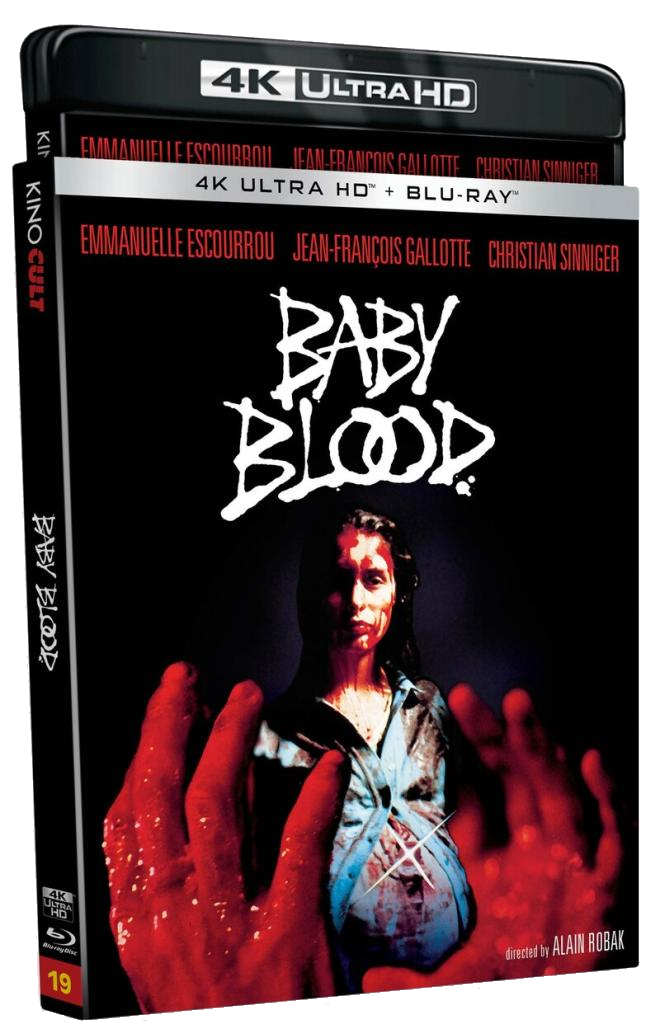 Kino Lorber (through Kino Cult) delivers Baby Blood on a 4K UHD/Blu-ray combo, with both discs housed in a standard case with a slipcover. Both the slipcover and the case contain the same artwork. The audio commentary track can be found on both discs, but only the Blu-ray has additional trailers.