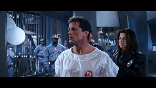 The color timing pulls back some of the harder reds to give a little more natural, a little cooler coloring to the film while avoiding any kind of hard teal push. When you see that sky over San Angeles it’s nice and bright blue compared to the hazy yellow of the older Blu-ray. It’s certainly a difference but overall one for the better. If I have a gripe I do feel that some scenes felt a little too bright, the whites a little too hot. The main offender there was when they thawed John Spartan out and updated him about the future. That scene just was, well, bright!