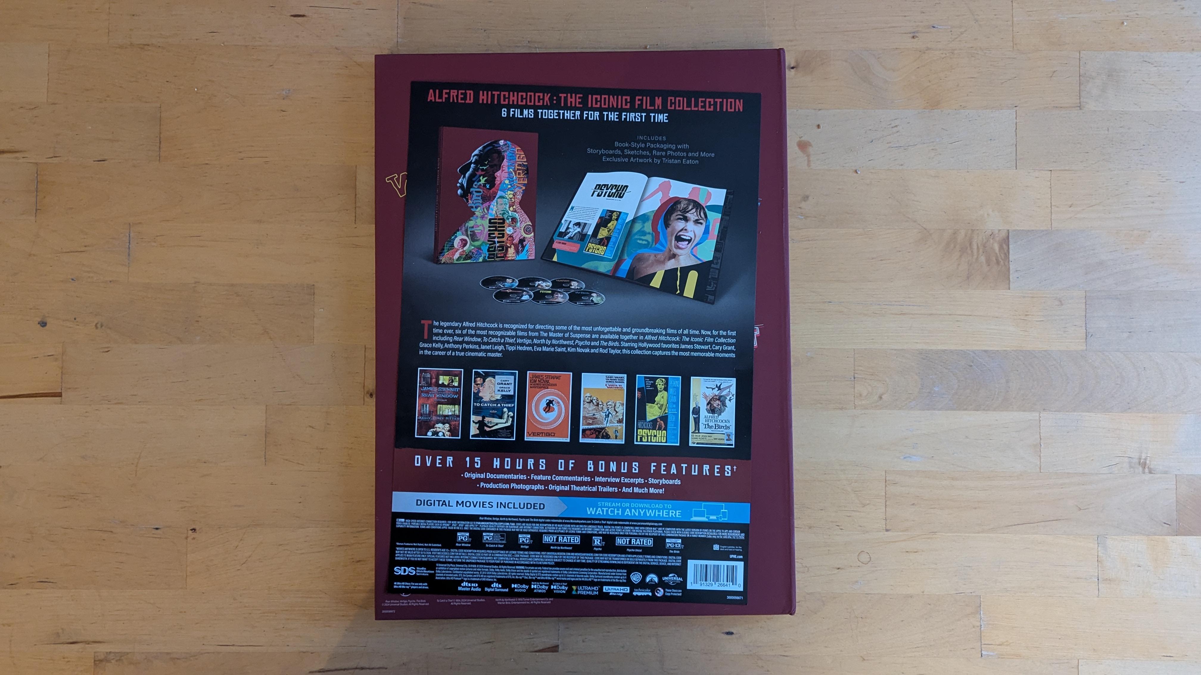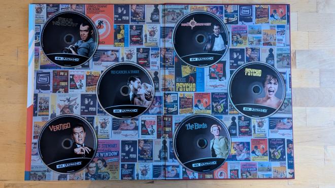 The master of suspense comes home with a special deluxe book set big enough to fit his stature. The Alfred Hitchcock: The Iconic Film Collection is a limited edition six-disc six film coffee table book set offering To Catch A Thief, Vertigo, North by Northwest, Psycho, The Birds, and Rear Window. All of the discs present are identical to the ones already available including the newly released North by Northwest from Warner Bros and To Catch a Thief from Paramount - just with different disc artwork designed to match the four other films from Universal. There is a digital slip, but it's a bit of an odd duck. One code unlocks Vertigo, Psycho, The Birds, and Rear Window while another code unlocks North by Northwest. Those two codes are Movies Anywhere compatible. Flip the slip over and you have a code for To Catch a Thief only this one is redeemable through Paramount's service and is not Movies Anywhere compatible. Get all that? After all the cool pages of photos and blips and blurbs, the six discs are held in the book in recessed holes with secure center tabs. So no thin paper sleeves or any of that nonsense.