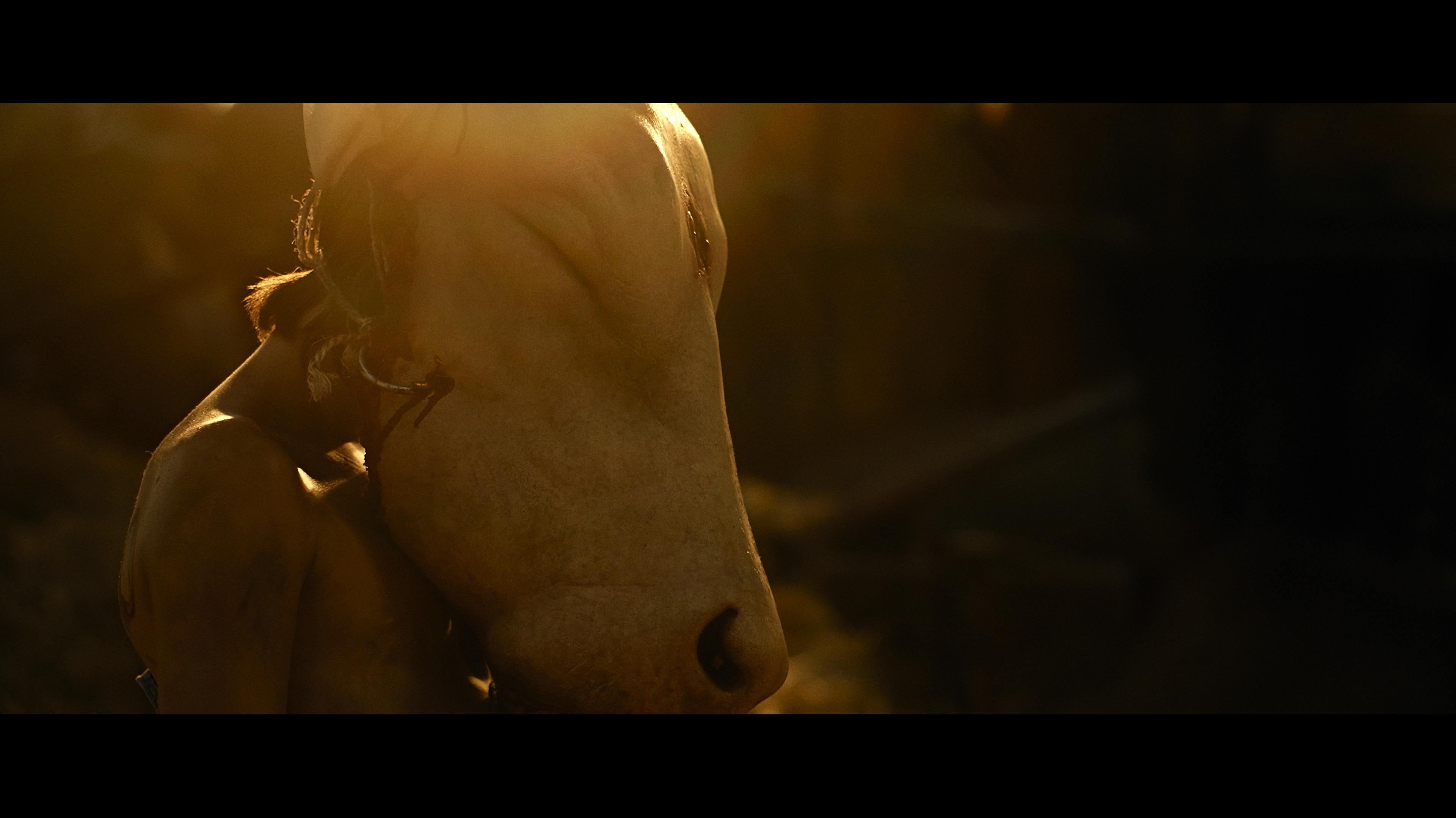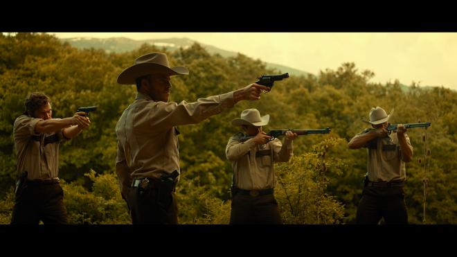 The heavily-stylized cinematography noticeably limits the contrast balance, giving the visuals an extra grimy feel that complements the Texan climate's sweltering, muggy heat. Nevertheless, whites come through cleaner with a bit more brilliance, and specular highlights have a crisp, radiant intensity to them while maintaining excellent detailing within the hottest areas. Likewise, colors are also affected by the monochromatic palette, which favors earthy browns, yellows and tans, and the HDR10 presentation remains true to that aesthetic design, furnishing the gory violence with heavy swathes of marigold, butterscotch, sepia, dingy mocha and a mustard shade in the grass. In spite of that, facial complexions appear healthy and accurate to the climate with lifelike textures while reds have a particularly thick garnet tone, and greens range between a faded moss and a dark juniper.