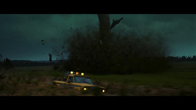 “Fine film grain is apparent throughout, but nowhere near noisy or intrusive. That one static shot with lightning flashes at the beginning still looks janky as ever but that’s just charm at this point. Facial features, Hoffman’s wild attire, and little fine details in the team’s vehicles are all on display with terrific clarity. Faces actually look like real human faces, not pod people who got interrupted halfway into their cloning process. I was also very impressed with how well the old CGI tornado effects held up and blended with the improved resolution. Some fake rain effects still stick out, but they always have.