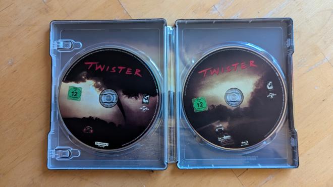 Twister lays waste to 2160p 4K UHD Blu-ray once again, this time courtesy of German boutique Turbine with a two-disc 4k UHD + Blu-ray SteelBook. For this release, the 4K edition has been giving a roomier encode with a triple-layer BD100 disc with a Region Free BD50 for the 1080p edition - which as also been remastered. The two discs are housed in a genuinely lovely SteelBook replicating the original classic theatrical poster art which quite easily outshines the dippy SteelBook art we got here stateside. Each disc loads to a language menu, German or English, so you won’t have to worry about deciphering the menu tabs or changing the language option. Click English and you’re off to the races.