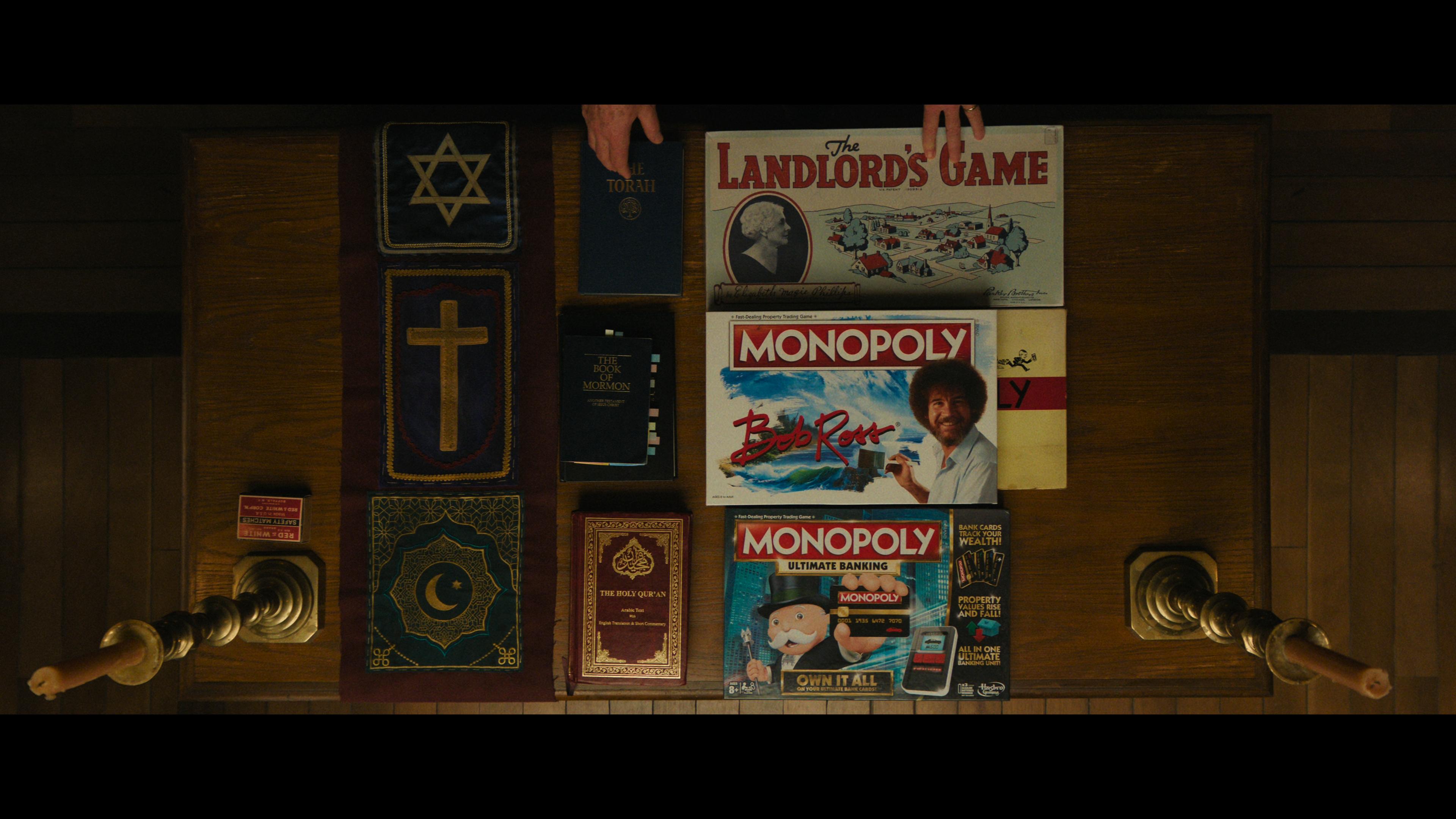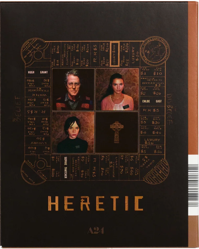 Heretic is blessed with a single-disc 4K UHD Digibook release from A24. This 4K edition appears to be exclusive to the A24 Shop while you can readily find the Blu-ray on Amazon, in the wild at Barnes & Noble, and even at Walmart. Not sure how long that exclusivity period will last, but just an FYI if you do find Heretic in the wild, make sure you check the back of the packaging that it is in fact the 4K disc. There’s nothing outward on the packaging to suggest that so read the fine print! The disc is pressed on a Region Free BD66 disc, housed in a paper digipak, with six art cards with behind-the-scenes production photos. But what’s really cool is if you flip them over, you can put those cards together to create one of the Monopoly iteration game boards! You just need to supply your own garishly colored fake money and game pieces. The disc loads to an animated main menu with standard navigation options.