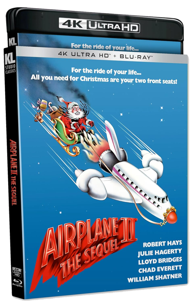 Airplane II: The Sequel takes off for its first 4K UHD release with a two-disc 4K UHD + Blu-ray from KLSC. A BD100 serves the 4K (even though a BD66 would have done the job for how much disc pace is leftover), and a Region A BD50 serves up the 1080p. The discs are housed in a standard two-disc case with identical slipcover artwork.
