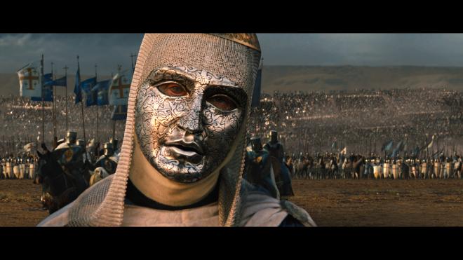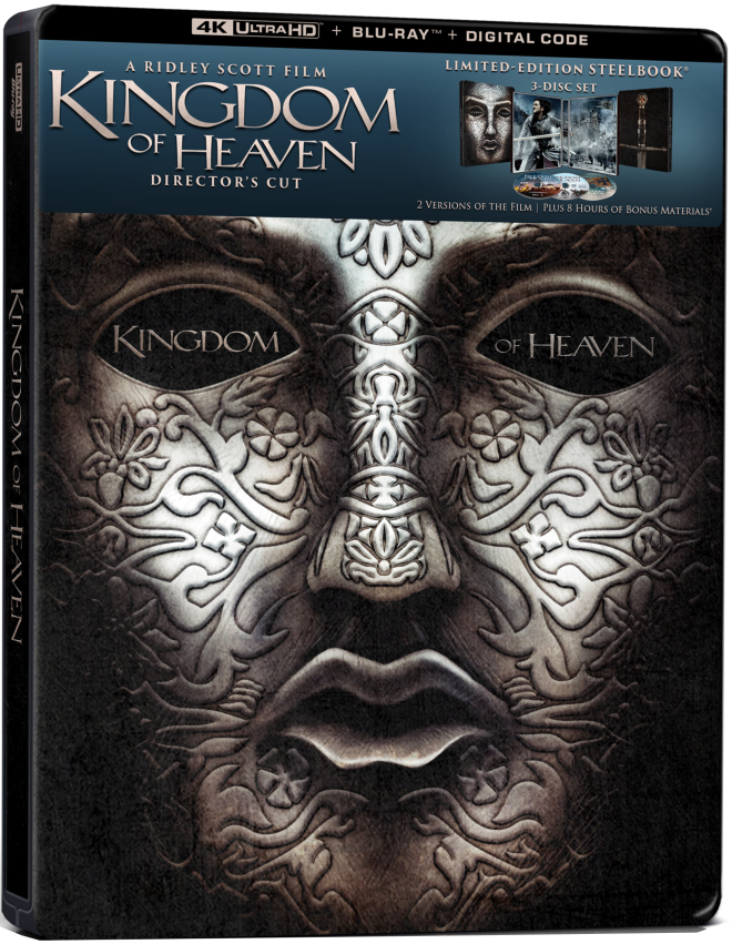 Kingdom of Heaven celebrates its 20th Anniversary with a fitting three-disc 4K UHD + two Blu-ray + Digital release from Disney/Sony in an appealingly artful SteelBook. The 4K version is pressed on a BD100 disc, and a remastered 1080p version has a BD50 disc, with another BD50 reserved for the bulk of the bonus features. The discs get their own trays without stacking. The cover art featuring the mask of King Baldwin has nice raised features with Balian’s sword on the back. The discs load to animated main menus with standard navigation options letting you choose between the Roadshow Cut with overture and intermission, or the slightly shorter Director’s Cut that doesn't have those segments. Just an FYI the audio commentaries are exclusive to the Roadshow length.