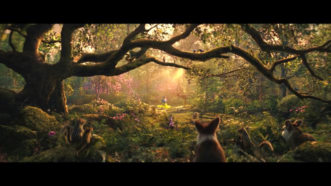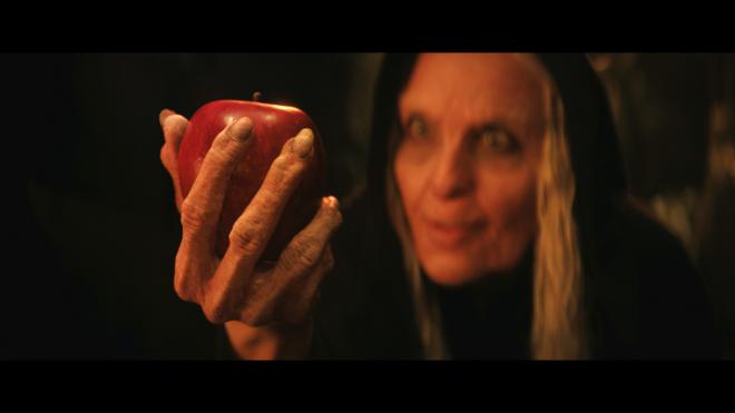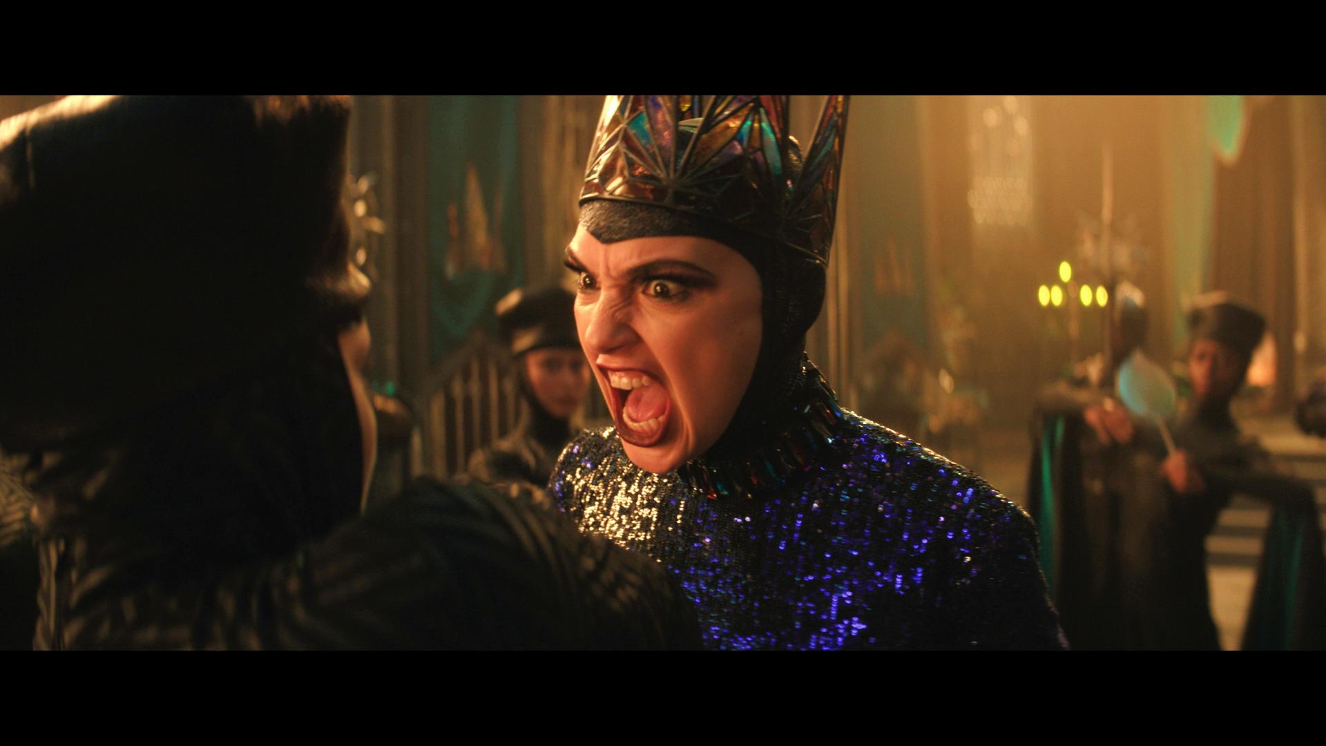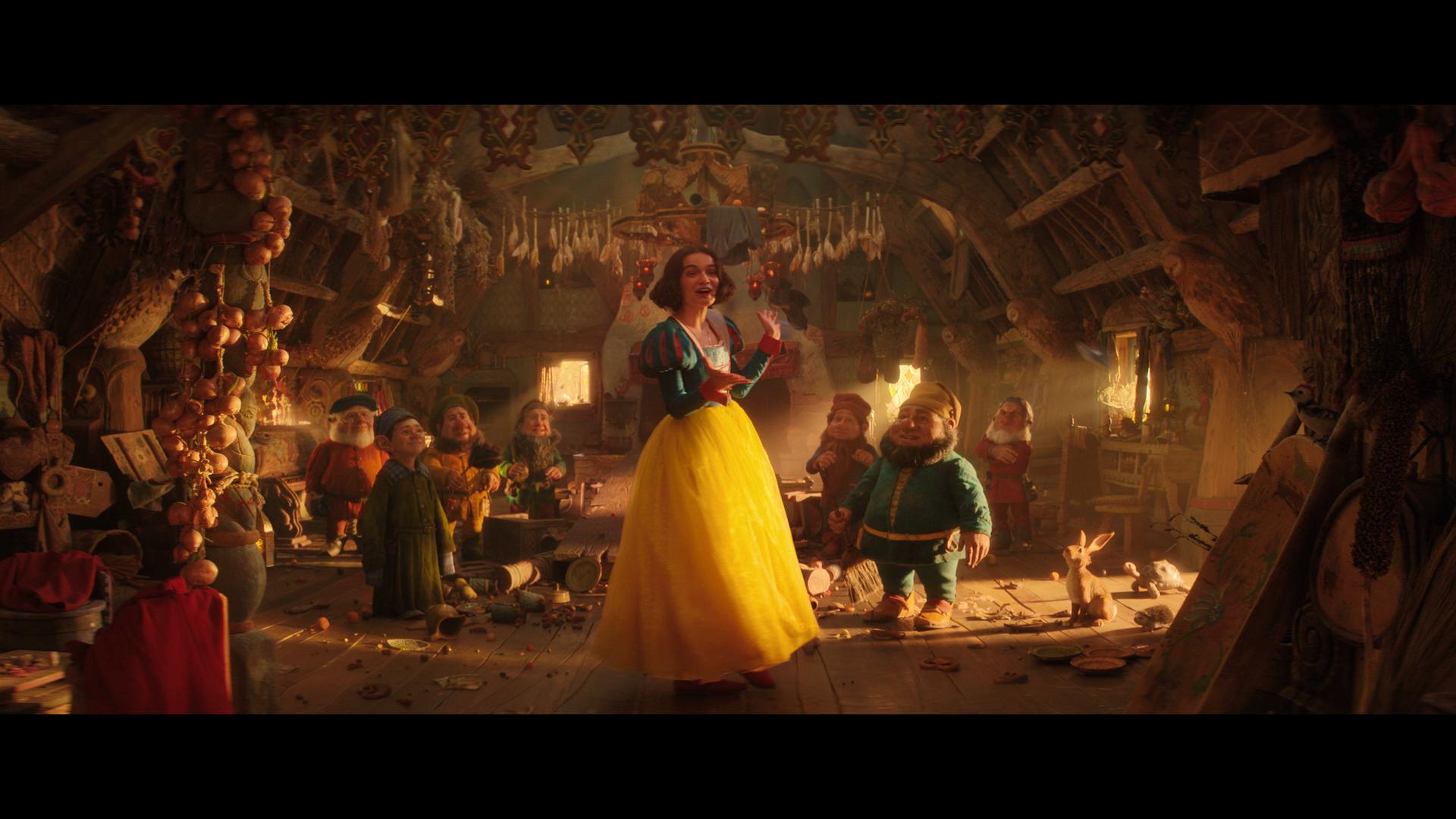 On 4K UHD, Snow White enchants with an often lovely Dolby Vision transfer. Keeping to the magical visuals of your favorite Disney classics, this film is a brightly colorful affair. This HDR grading really takes center stage when Snow finally gets to the orchard to pick apples. The film often features some warming golden tones while enjoying splendid primary saturation. Given Snow's dress, Blues, Reds, and Yellows enjoy plenty of attention. Within the Evil Queen’s quarters and her dress, the shadows and deep, creepy emerald greens and purples look equally impressive. Details are sharp and strong for all of the human actors, their costumes, makeup, and hairstyling. Where things get dicey is with the number of CGI scene extensions, characters, and animals. That line between practical sets and generated scenery is pretty tight. Some of the CGI animals look great and are well rendered, but then there’s the Dwarfs, who can often look weightless compared to the practical physical characters and sets. Sometimes they come through well and stand up to the scrutiny under high resolution, other times they just lack a believable presence. All this is to say that most of the time, this Dolby Vision transfer is a delight.