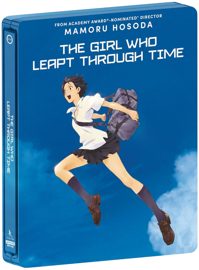 The Girl Who Leapt Through Time leaps onto 4K UHD Blu-ray in a two-disc release housed in a gorgeous SteelBook case. The exterior of the case features a shot from the film (which has adorned previous-release artwork), with Makoto jumping through the air to manipulate time around her. Inside the case are the two discs, containing the film in both 4K/HDR and HD/SDR.