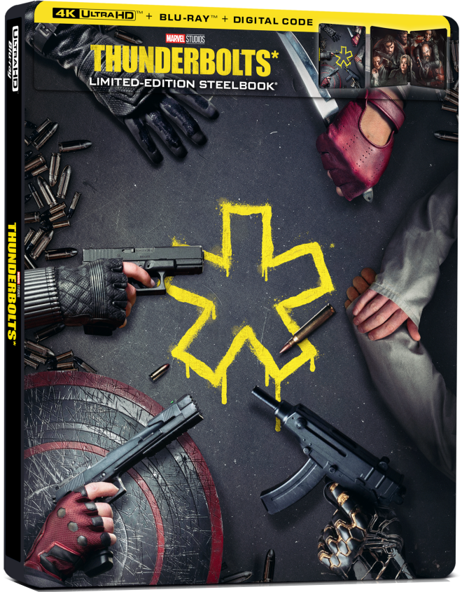 Thunderbolts* smashes onto 4K UHD from Marvel/Disney by way of Sony with a two-disc 4K UHD + Blu-ray + Digital SteelBook release. The 4K is pressed on a BD66 disc with a BD50 serving up the 1080p and the bulk of the extra features. The SteelBook is a slick piece of work, a clever design on the front giving our heroes their weapons of choice, with the back offering the explanation for the asterisk in the title.