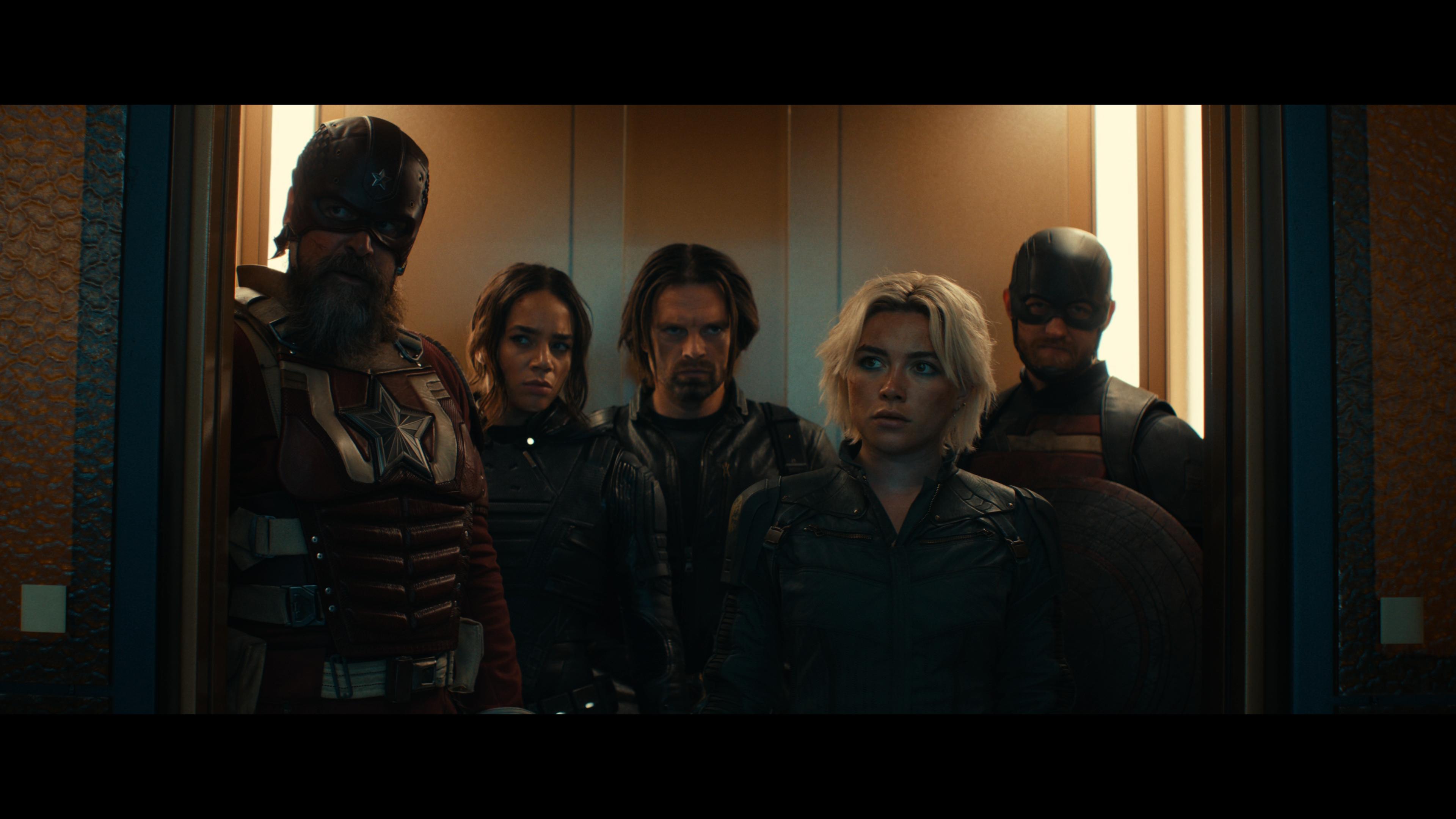 It appears that Disney has comfortably moved past their Atmouse past, treating Thunderbolts* with an active and nicely aggressive Dolby Atmos audio mix. Between the few quiet conversational sequences we have between our characters and the congressional hearings, I was impressed that the mix makes an effort to convey a broad sense of space through the channels without relying solely on action beats to fill the soundscape. The front/side channels carry most of the auditory load at times, but surrounds, rears, and height get their moments to shine. Of course, action sequences see their day in the sun as well. LFE has some excellent rumble, especially in the last act.