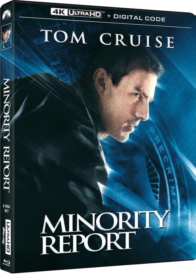 Minority Report predicts its own 4K UHD Blu-ray in a two-disc release, housed in a standard case with a removable slipcover. Both the case and slip contain identical artwork, going back to the artwork that adorned the DVD (and original theatrical poster), ditching the god-awful artwork from the Blu-ray.