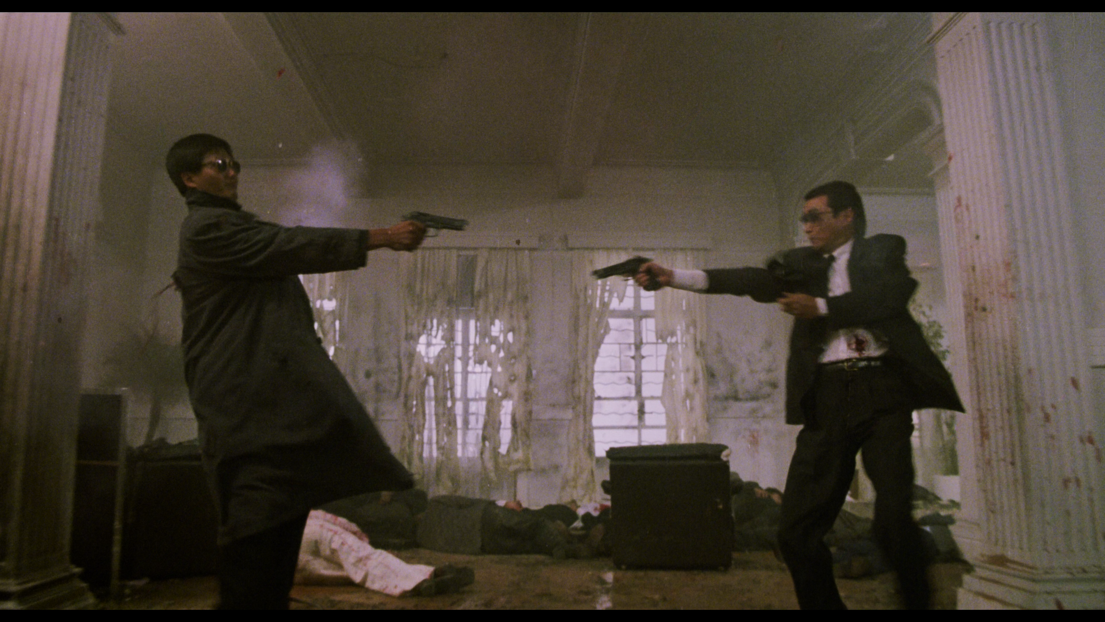In A Better Tomorrow II, John Woo continues experimenting with what later becomes his trademark operatic violence, and honestly, watching him push further in this direct follow-up is worth the price of admission alone. And as a fan, it's pretty cool seeing him in these early stages of perfecting his signature style and orchestrating his balletic gunfights. The slow-motion shootouts are more elaborate while the body count increases, showing the director leaning heavily into the stylistic mayhem he's best known for. The final climactic showdown in Ko's (Kwan Shan) mansion erupts in explosions, double-fisted pistol action, and ridiculously extended moments of tension, like the gunfight between Ken (Chow) and the mysterious hitman Chong (Lung Ming-yan). It is evidence of a confident filmmaker revolutionizing on-screen violence into captivating visual poetry.