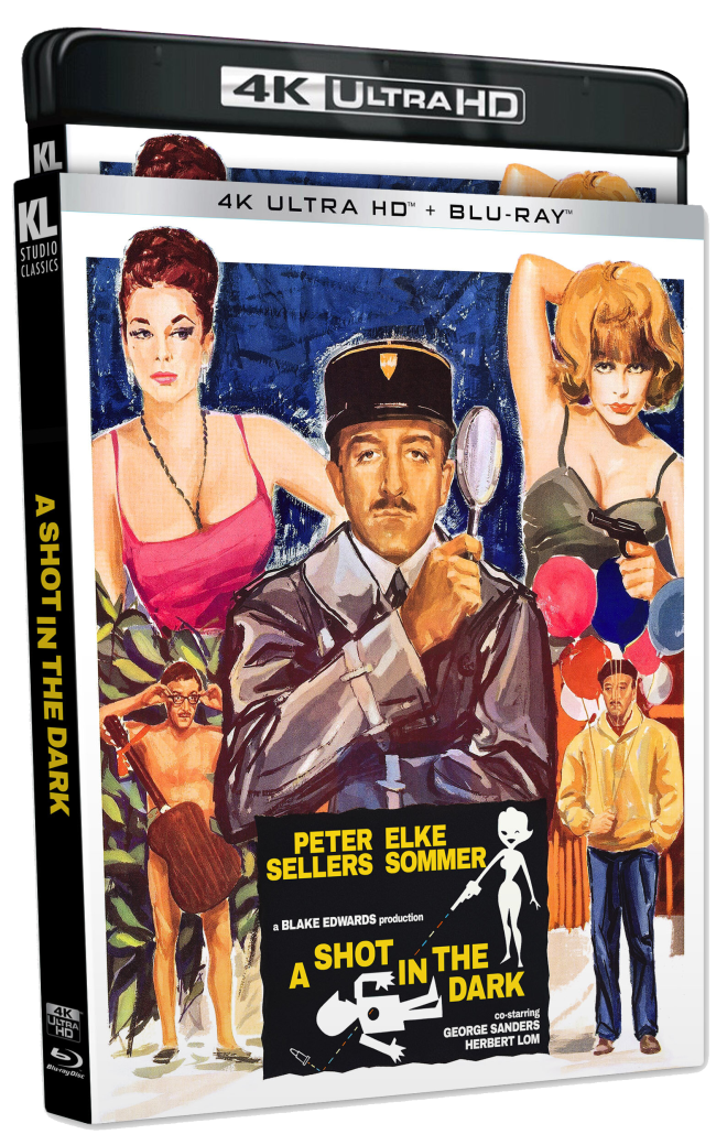 A Shot in the Dark takes its first stab at 2160p with a two-disc 4K UHD + Blu-ray release from Kino Lorber Studio Classics. The 4K is pressed on a BD100 disc with a Region A BD50 serving up 1080p and the bulk of the extras. The discs are housed in a standard black two-disc case with reversible insert art and slipcover.