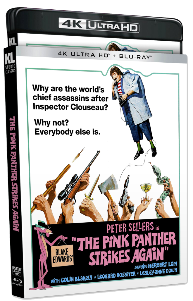 Following the trail of its sibling films onto 2160p, The Pink Panther Strikes Again arrives as a two-disc 4K UHD + Blu-ray release from Kino Lorber Studio Classics. The 4K is pressed on a BD100 disc with a Region A BD50 serving up 1080p and the bulk of the extras. The discs are housed in a standard black two-disc case with reversible insert art and slipcover.