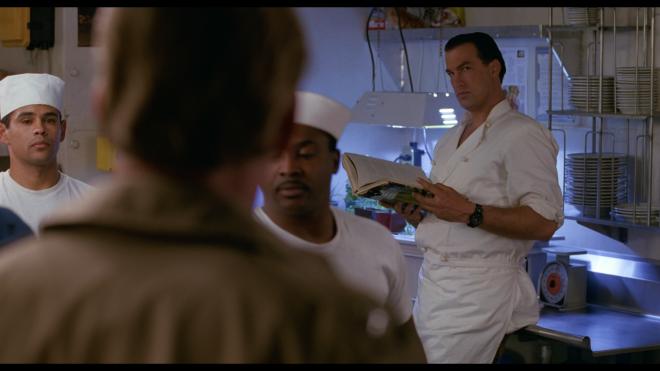 Now, some 19 years ago, our own Peter Bracke reviewed Warner’s first (and amazingly only) Blu-ray release of Under Siege. Looking back on that review, I don’t entirely disagree with his points about the film’s limitations, but it read as though, looking through the lens of the cartoon version of himself, Seagal was at the time (and still is today) versus the action star he was becoming when the film was released. Now I don’t hide away from the idea that this film is a true-blue Die Hard clone, but it’s at least a good one. When I was all of 10, my Dad and I had become Seagal fans, rented/owned Seagal’s previous films, and Under Siege was the first one we saw in theaters. We were blown away. Big action, colorful badguys, and Seagal was at least halfway convincing in his role as a former SEAL Chief-turned-cook. This film should have been the first leg in a longer, better career for the action star.