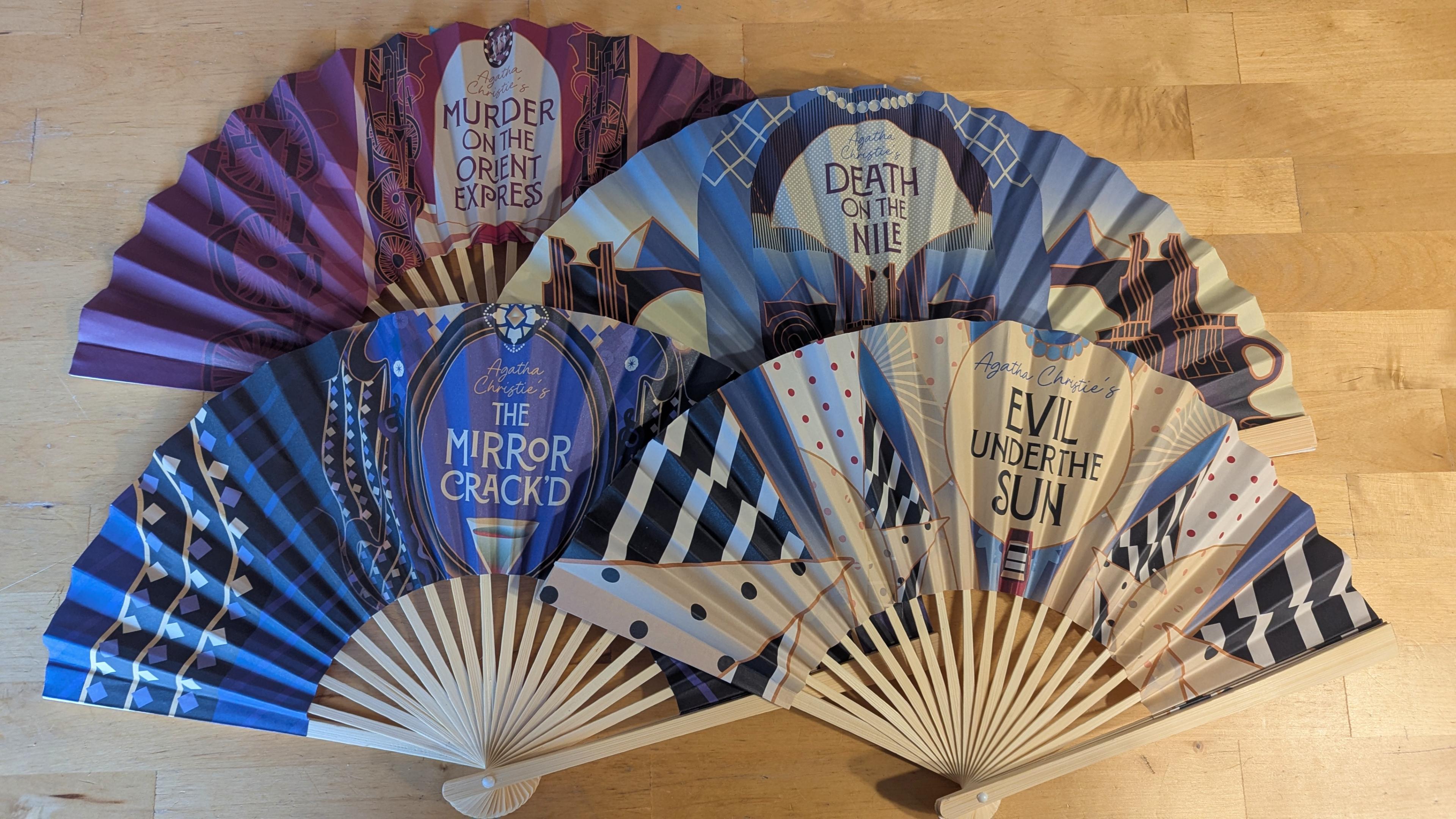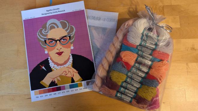 Now, every once in a while, when we get review copies, we’ll see some interesting swag items pop up, like a t-shirt or badly tasting themed candy. I got some of the worst beef jerky I've ever tasted once. We don’t report on this because it’s usually a “that’s kinda cool, but so what?” sort of item, also it looks like bragging. However, this is some next-level stuff. We received four film-themed hand fans that are very cool to look at. But the wildest thing I’ve ever seen come our way is a complete Agatha Christie portrait cross-stitch pattern kit, complete with yarn, needle, the works! Between a couple of poorly-healed broken knuckles, I’m not sure if my fingers are dexterous enough these days, but I’m going to give this my best shot. It's too wild not to at least try!