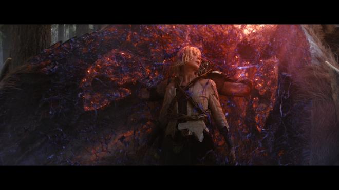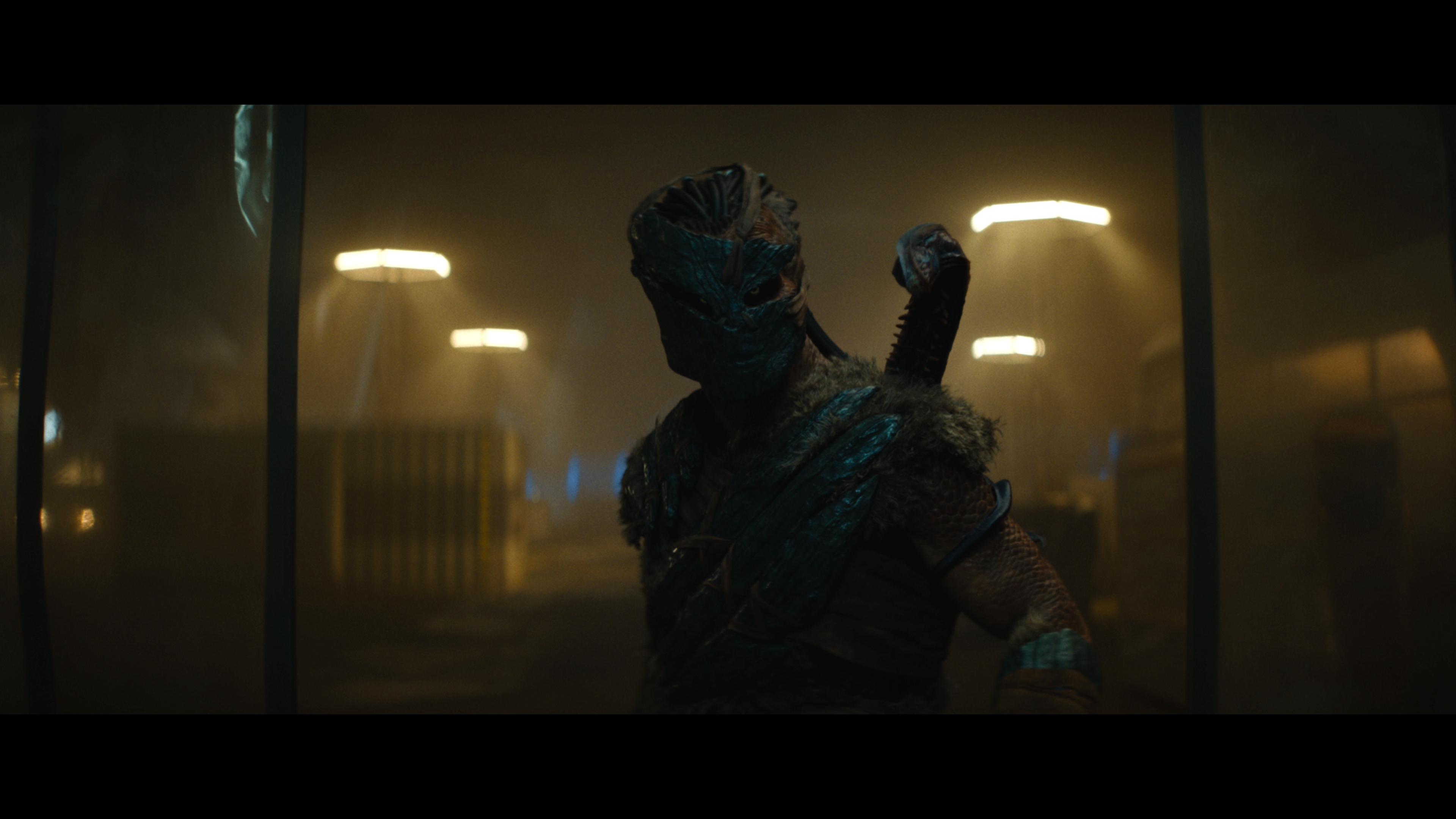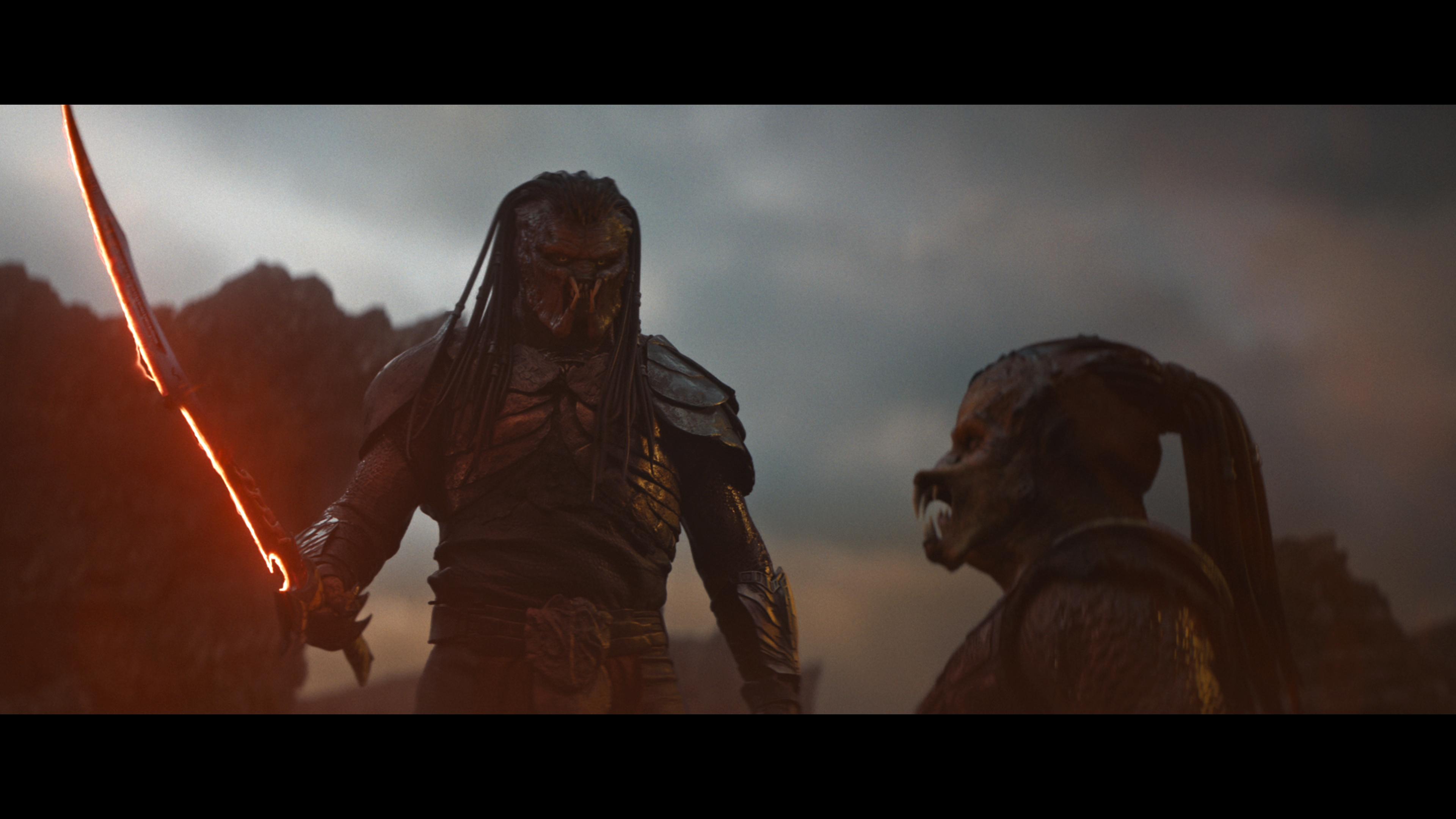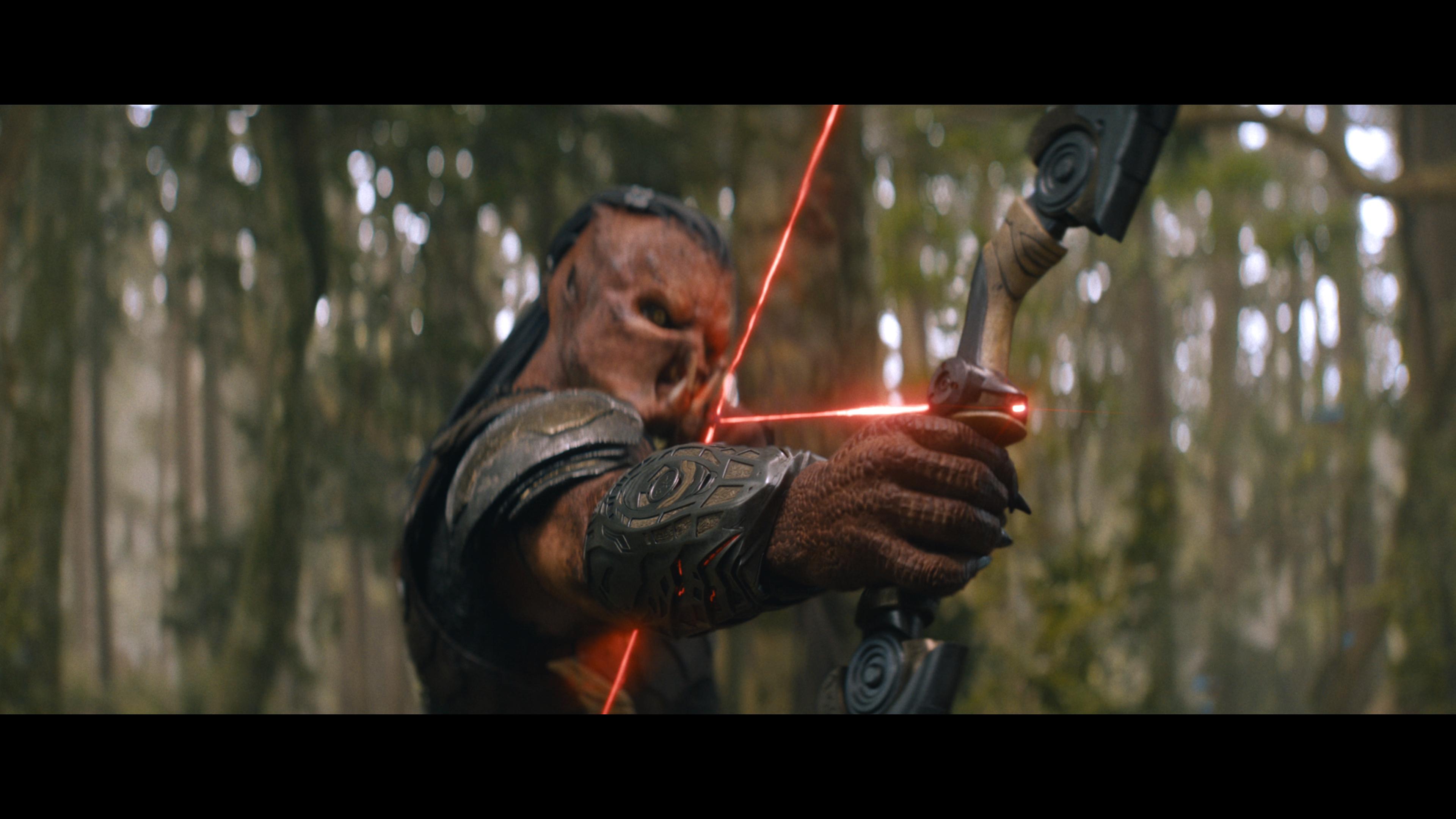 As much as I would have absolutely shelled out a hefty penny for a 3D Blu-ray release, I can’t deny that this 2160p Dolby Vision transfer of Predator: Badlands is a beast. Shot digitally and finished on a 4K Digital Intermediate, the transfer delivers impressive details that are often striking to look at. The makeup effects for the practical creature effects, make-up VFX, and dismembered android pieces are quite something. I was really impressed with the blend of practical makeup and digital effects for Dimitrius Schuster-Koloamatangi as the helmet-free Dek. Just as impressive was the combination given to Elle Fanning as Thia. Obviously they didn’t cut her off at the waist and throw her on his back (they could have done that but I think she’d like to keep her real legs…). That’s when the care and attention to blending practical and digital approaches are most effective. If I had to knock this transfer for something, it’s that the higher resolution and HDR grade can negatively highlight some of the more weightless CGI effects shots. But where it counts, it’s a great-looking image. Depth is appreciable throughout (again, I’d have loved a 3D disc, because this was a lot of fun in IMAX 3D). The Dolby Vision grade gives black levels and shadows a healthy boost, especially for the opening sparring session between Dek and Kwei, which is quite dark and could otherwise be difficult to discern what’s going on. Primaries get plenty of time to shine. Given there isn’t any human blood here, all the other colors are given a splash while red is reserved for the various energy weapons utilized by your young Yautja.