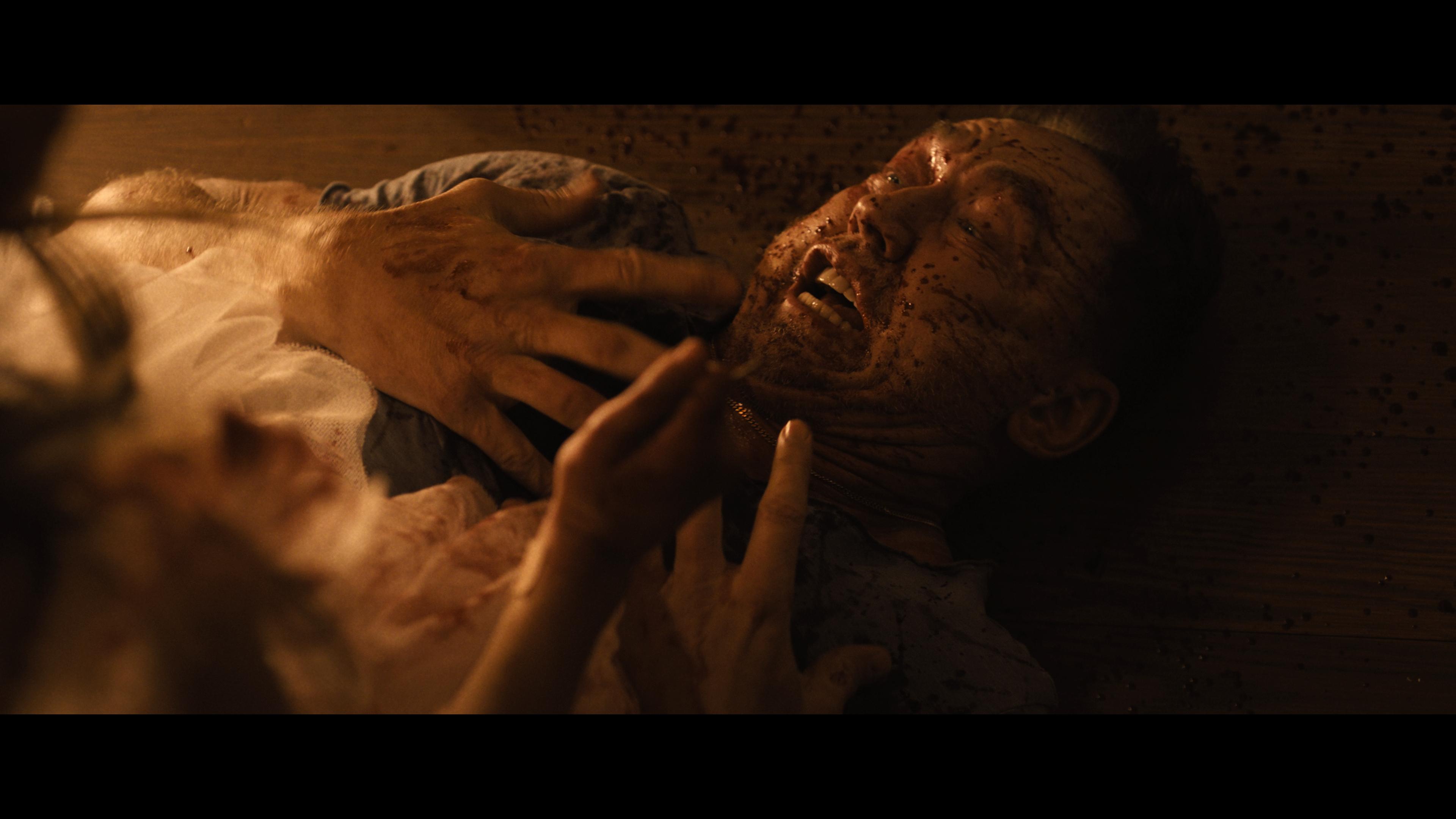 Well, if you’re looking for a film that’ll stress-test the black levels and shadows of your home theater setup, Abigail is a prime candidate! This disc offers a very strong 2160p Dolby Vision transfer for fans to enjoy, but the film, by nature, is very dark, shadowy, and has very limited light sources. To that point, details may seem a bit subdued at times, but it’s still a very sharp and clear image. When the lighting hits right, we can fully appreciate facial features, costuming, and the often incredible, intricate details in the creepy old mansion. Gory visual effects and the gallons of blood get plenty of attention. As I said, this is a darker, creepy flick, so lighting tends to come from soft lamps and fireplaces, so lighting skews a bit more orange; as such, key primaries don’t really stand out on their own dime. But with the HDR grade working its magic, those shadows are distinct and offer some nice dimensionality to the image.