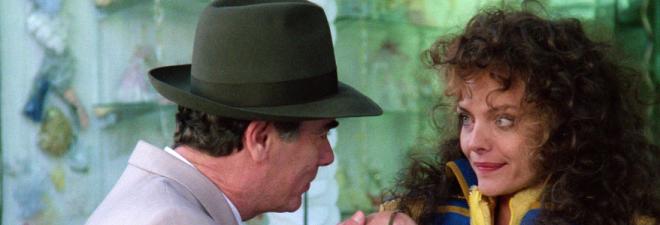 The screenplay by Barry Strugatz and Mark R. Burns (who would go on to write the underrated She-Devil starring Roseanne Barr) is a perfect blend of sensibilities for director Jonathan Demme. Married to the Mob is on the lighter end of his filmography. Something like The Silence of the Lambs, then, would be on the darker end of that spectrum. And something like Something Wild would be smack-dab in the middle. Married to the Mob has a plot that sounds extraordinarily dark, a story about gangsters, murder, jealous wives, and FBI-enabled governmental blackmail. And while it has all that going on, Demme mines the plot for all the humor and levity he can. There's enough room in all of it to find some time to get Chris Isaak shot to death while wearing a goofy clown suit.
