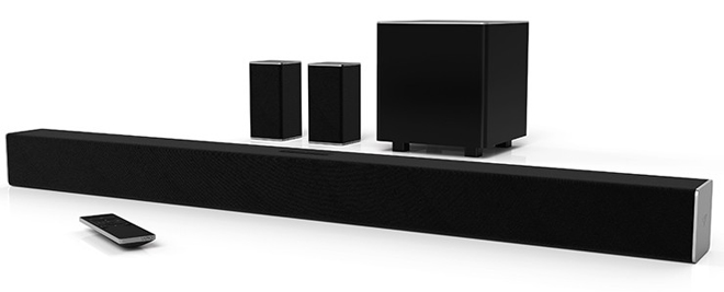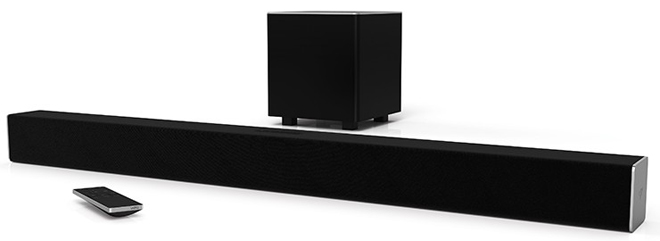 VIZIO SB3821-D6 SmartCast38" 2.1 Sound Bar System ($163) - This 2-channel 38" sound bar unit includes a separate 5.25" wireless subwoofer for dedicated low frequencies, offering a space-saving alternative to a full 5.1 system while still providing a notable upgrade over integrated TV speakers. The woofer is rated for 50-90 Hz, while the system as a whole has a frequency response of 50 Hz - 20 kHz. Though the unit lacks HDMI connections and video pass-through, it does include digital optical and RCA inputs along with Dolby Digital and DTS audio. Likewise, the sound bar features Bluetooth and Wi-Fi connectivity, and support for VIZIO's SmartCast system with Google Cast built-in, allowing users to control the speaker and stream music from the SmartCast app for mobile devices.