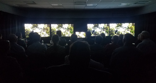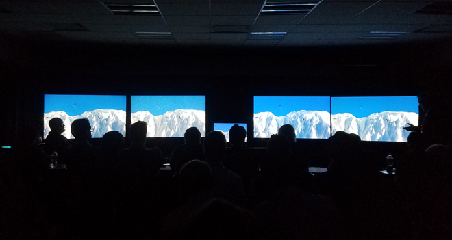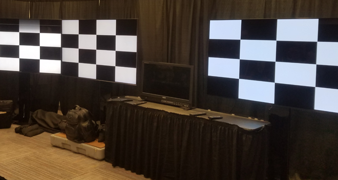 Unfortunately, the Samsung LCD was prone to its own troublesome local dimming quirk, this time related to crushed shadow detail. One clip of a starfield was darkened too much on the Samsung compared to the other TVs causing many stars to disappear. Likewise, a test pattern used for setting brightness levels was almost completely invisible on the Q90R as a result of its dimming process. The moderators actually had to pump up the brightness all the way to get it to show up. Of course, it should be noted that extreme local dimming issues like this did not occur during the demo material from real-world content.