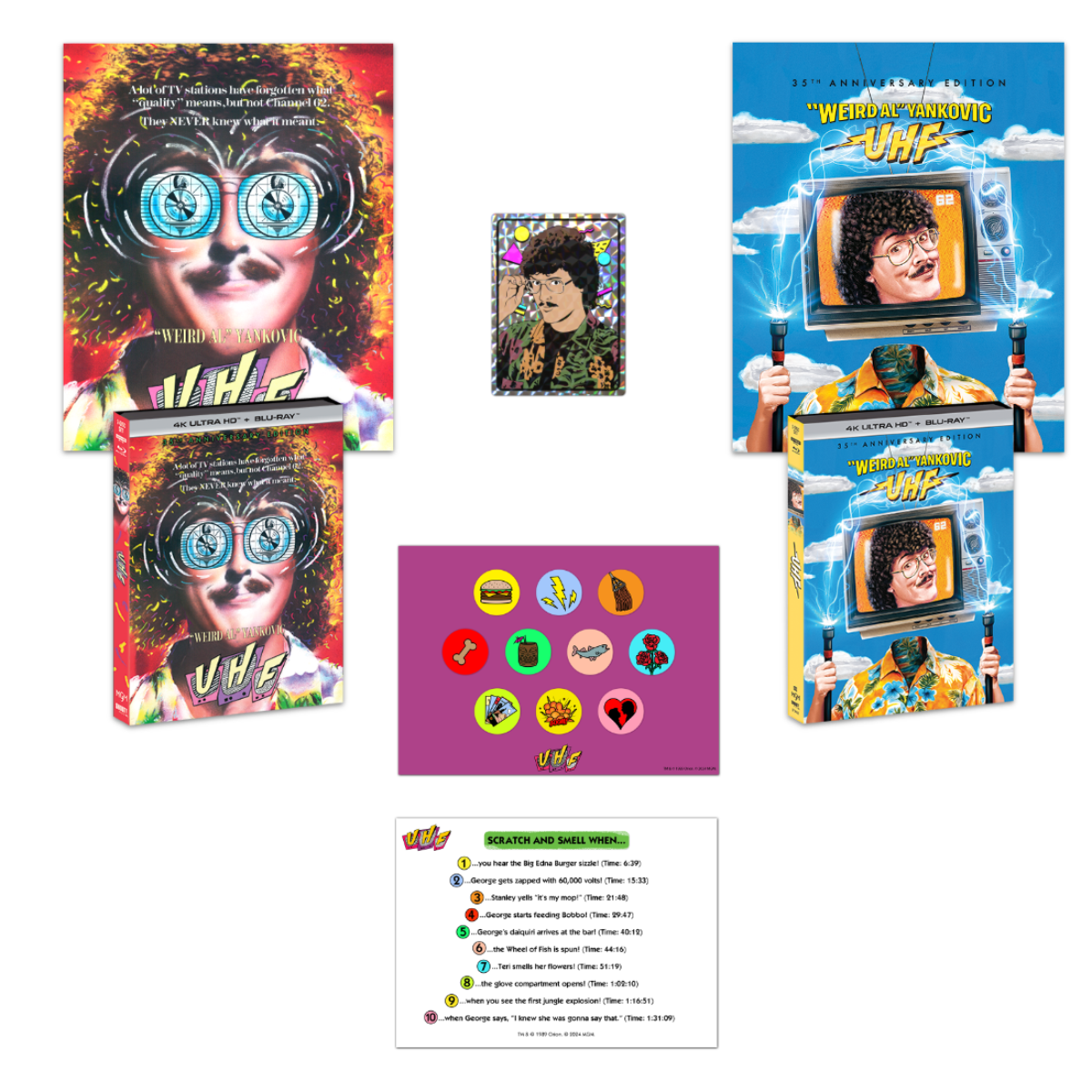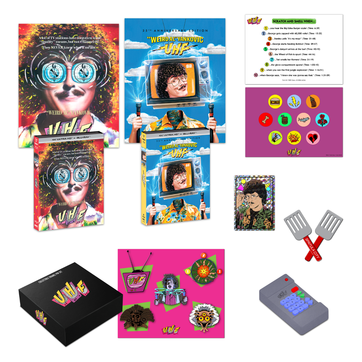 Deluxe Bundle: UHF 35th Anniversary Edition 4K UHD (same bonus features as wide release), posters of both original theatrical art and new illustration art, site-exclusive o-card with new illustration, prism sticker of Weird Al, brand-new Scratch-n-Sniff card for the movie, TV remote stress squeezer, Spatula City fridge magnet and an enamel pin set.
